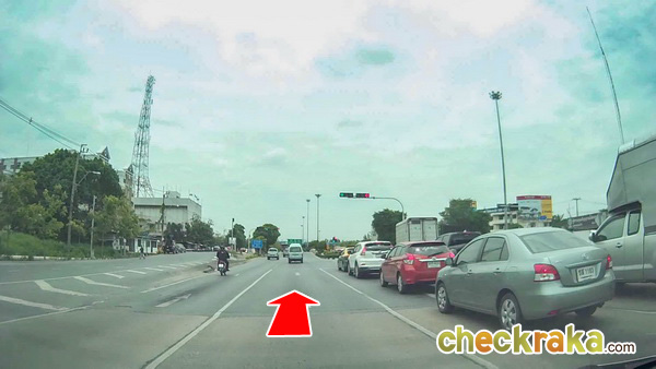 ขับตรงไปจะผ่านถนนกาญจนาภิเษก ขับไปตามป้ายถนนร่มเกล้า
