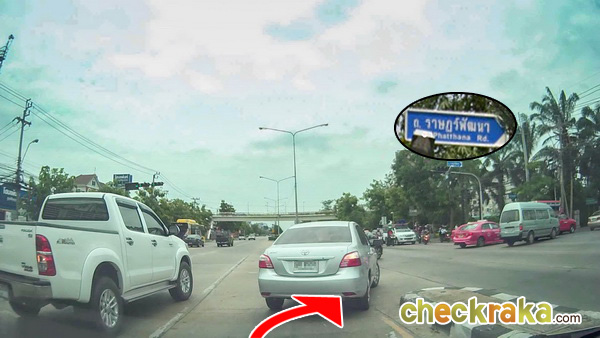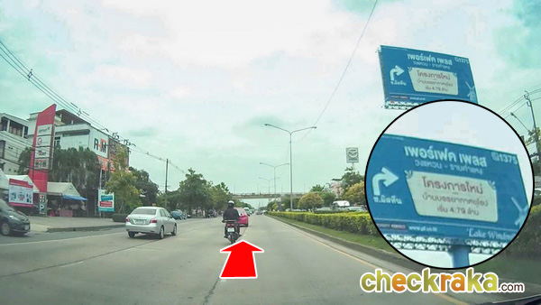 ระหว่างทางบนถนนราษฎร์พัฒนา ยังคงมีป้ายบอกทางไปโครงการเรื่อยๆ ค่ะ จากป้ายนี้ให้เตรียมเลี้ยวซ้าย