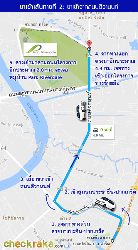 - ทำเลที่ตั้ง และการเดินทาง - โครงการ พาร์ค ริเวอร์เดล ตั้งอยู่บนถนนติวานนท์ ตำบลบางกะดี อำเภอเมืองปทุมธานี จังหวัดปทุมธานี ตัวโครงการนั้นตั้งอยู่ในสนามกอล์ฟ Riverdale Golf Club มีทางเข้า-ออกโครงการได้ 2 ทาง คือทางฝั่งถนนใหญ่ติวานนท์ และถนนทางหลวงแผ่นดินหมายเลข 345 โดยทางฝั่งถนนติวานนท์นั้นจะเป็นทางเข้า-ออกของสนามกอล์ฟ Riverdale Golf Club สามารถใช้ร่วมกันได้ค่ะ หากเดินทางมาจากทางถนนทางหลวงแผ่นดินหมายเลข 345 ฝั่งถนนสะพานนนทบุรี - บางบัวทอง เมื่อขับมาถึงสะพานปทุมธานี 2 ตรงไปอีกประมาณ 800 เมตรก็จะเจอทางเข้าโครงการแล้วค่ะ ซึ่งจากทางเข้านั้น ให้ขับไปตามถนนของโครงการด้านในอีกประมาณ 2 กม. ก็จะถึงตัวหมู่บ้าน Park Riverdale สำหรับอีกเส้นทางหนึ่ง จากบริเวณแยกสวนสมเด็จสามารถขับตรงมาตามถนนติวานนท์ไปอีกประมาณ 6.1 กม. ก็จะเจอทางเข้าโครงการ Riverdale Golf Club แล้วขับเข้าไปในถนนของโครงการอีกประมาณ 2.0 กม. ก็จะถึงตัวหมู่บ้าน Park Riverdale แล้วค่ะ นอกจากนี้ยังสามารถเดินทางเข้า - ออก โครงการได้ด้วยรถไฟฟ้าสายสีแดง ช่วงบางซื่อ - รังสิต โดยสถานีที่ใกล้ที่สุดคือ สถานีรังสิต ตั้งอยู่บริเวณถนนรังสิต-ปทุมธานี และถนนกำแพงเพชร 6 บริเวณหมู่บ้านรัตนโกสินทร์ 200 ปี มีระยะห่างในการเดินทางที่ใกล้ที่สุดประมาณ 8.8 กม. ปัจจุบันรถไฟฟ้าสายสีแดง ช่วงบางซื่อ - รังสิต อยู่ในระหว่างการก่อสร้าง คาดว่าจะแล้วเสร็จพร้อมเปิดให้บริการประมาณปี พ.ศ 2562 ค่ะ