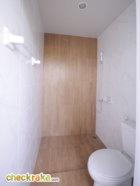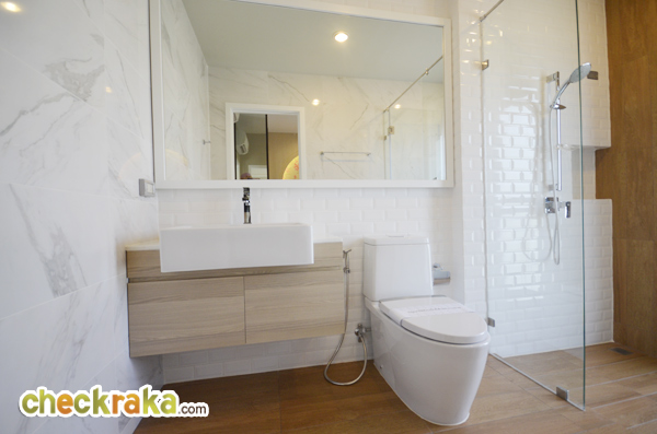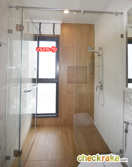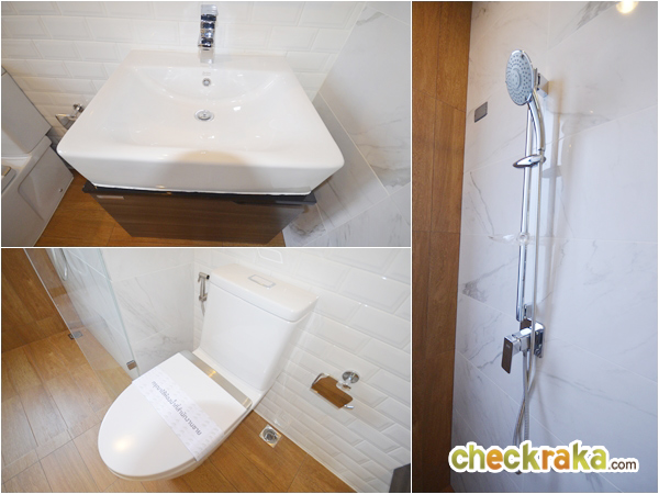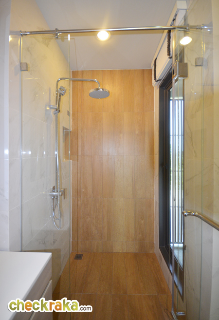ส่วนอาบน้ำ มีประตูกระจกนิรภัยกั้นแยกส่วนเปียก/แห้ง มีฝักบัวพร้อมเจาะช่องสำหรับวางของให้