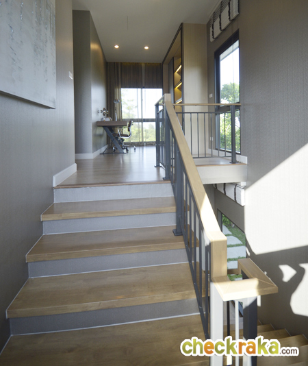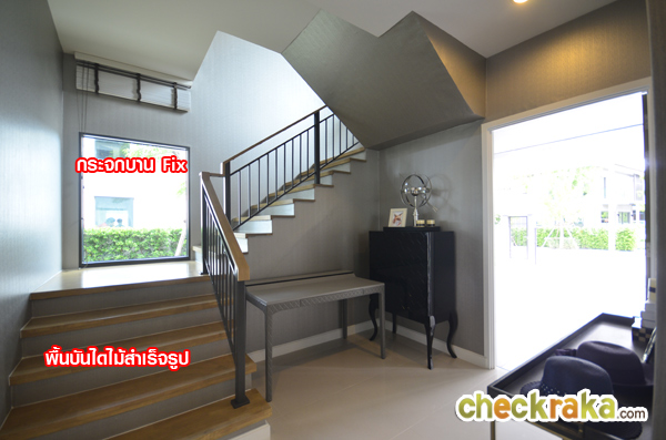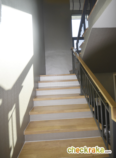 เปรียบเทียบกับบ้านเปล่า ตัวบันไดจะเป็น 3 Step ตรงชานพักของ Step แรก มีกระจกบาน fix สำหรับรับแสง