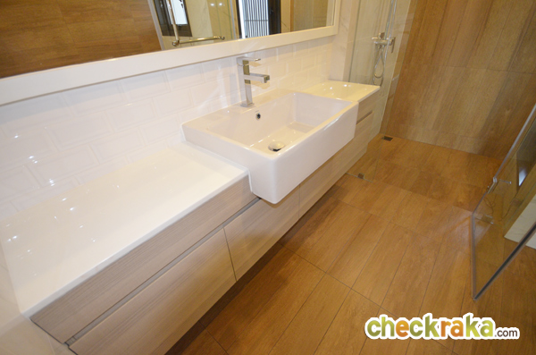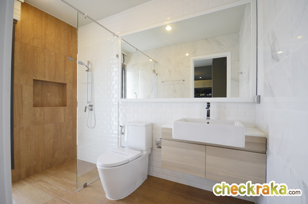 จัดวางอ่างล้างมือขนาดใหญ่ ติดกระจกบานใหญ่ กั้นแยกส่วนเปียก/แห้ง มีฝักบัวเจาะช่องระบายอากาศ