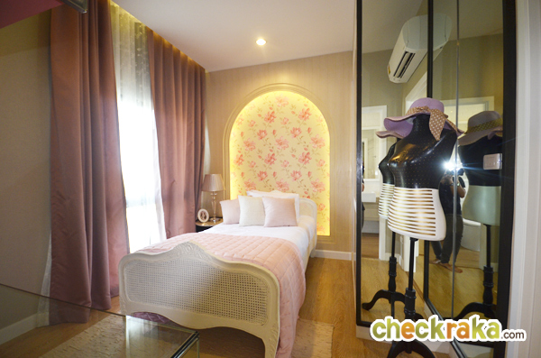 แต่ห้องนี้ตกแต่งให้เป็นห้องสำหรับผู้หญิง เน้นสีชมพูขาว หวานแหวว วางเตียงนอน 3.5 ฟุตไว้