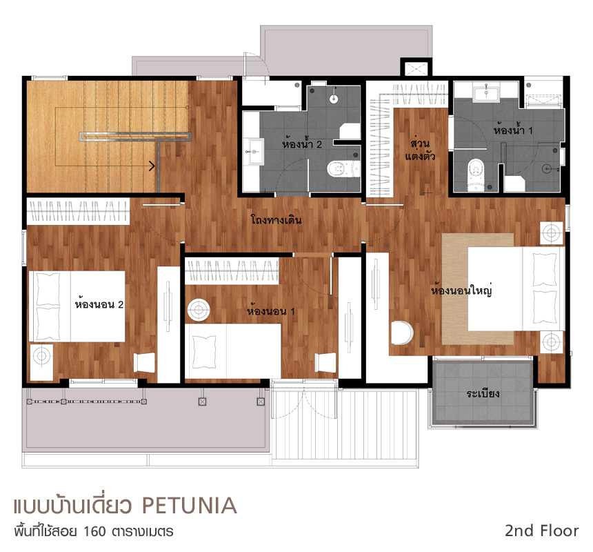 1. แบบบ้าน PETUNIA - Type M บ้านเดี่ยว 2 ชั้น ขนาดที่ดินเริ่มที่ 56 ตร.ว. ขนาดพื้นที่ใช้สอย 160 ตร.ม. 3 ห้องนอน 3 ห้องน้ำ ส่วนพักผ่อนรับแขกและรับประทานอาหาร ห้องครัว ที่จอดรถ 2 คัน