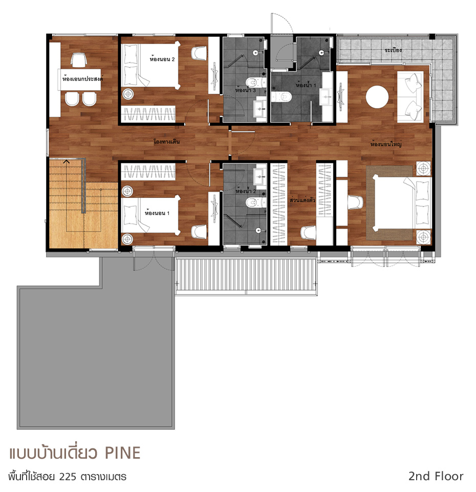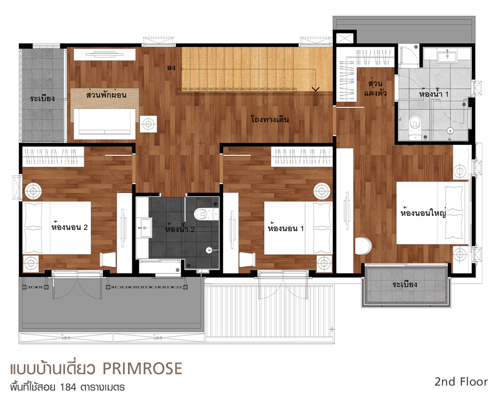 ฟังก์ชันบ้านของห้องต่างๆ เมื่อขึ้นมาที่ชั้น 2 จากโถงของชั้นนี้ จะมีทางเดินไปห้องนอนทั้ง 3 ห้อง ตามรูปนี้เลย