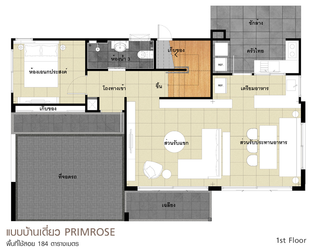 2. แบบบ้าน PRIMROSE - TYPE L บ้านเดี่ยว 2 ชั้น ขนาดที่ดินเริ่มที่ 63 ตร.ว. ขนาดพื้นที่ใช้สอย 184 ตร.ม. 4 ห้องนอน 3 ห้องน้ำ ส่วนพักผ่อนรับแขกและรับประทานอาหาร ห้องครัว พื้นที่อเนกประสงค์ ที่จอดรถ 2 คัน