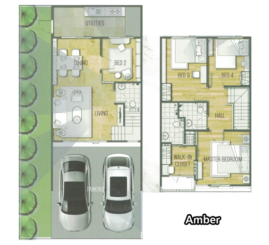 บ้านแบบที่สองคือ Amber ทาวน์โฮมแฝด 2 ชั้น หน้ากว้าง 5.7 ม. ที่ดินเริ่มต้น 28 ตร.ว. พื้นที่ใช้สอยประมาณ 132 ตร.ม. จำนวน 4 ห้องนอน 3 ห้องน้ำ พร้อมพื้นที่รับแขกและรับประทานอาหาร จอดรถ 2 คัน