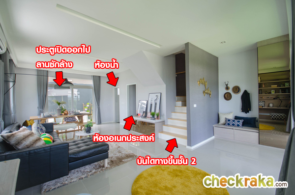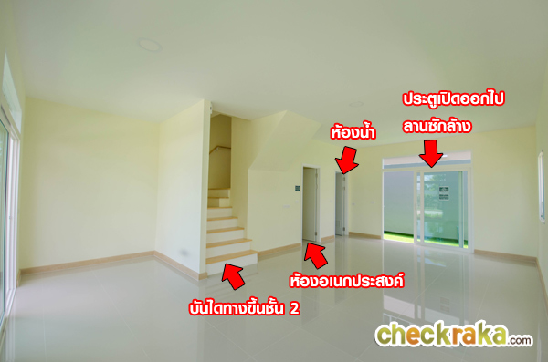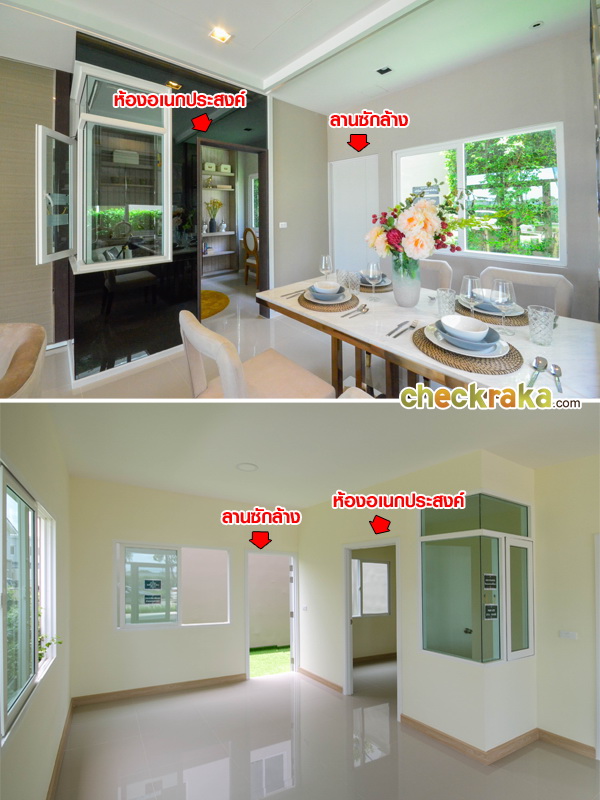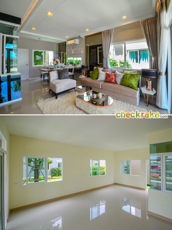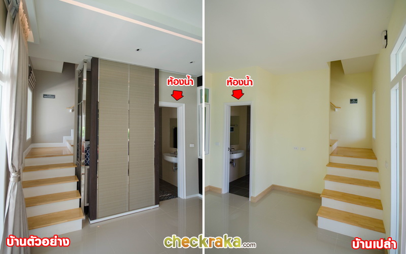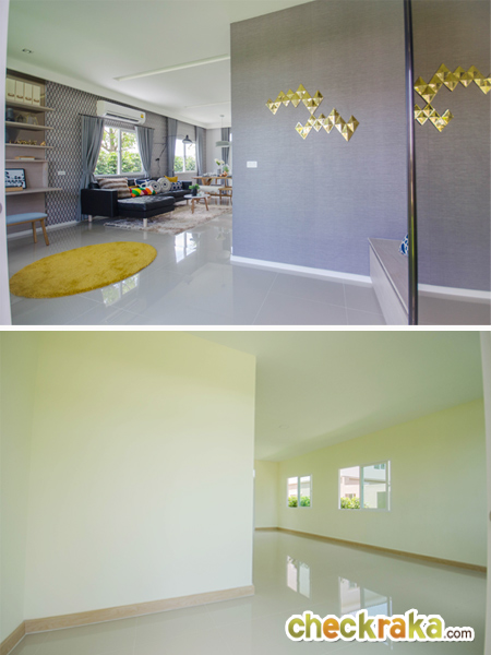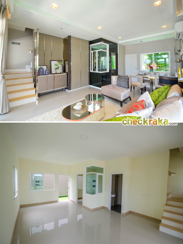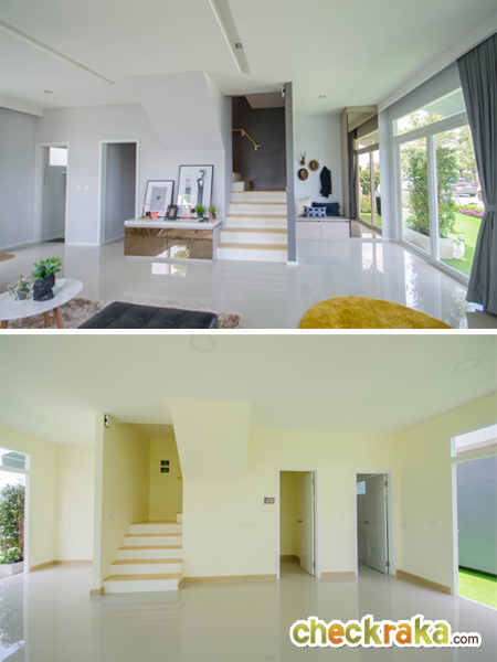 เปิดประตูเข้ามาที่ข้างในตัวบ้าน รูปบนคือบ้านตัวอย่างพร้อมตกแต่ง รูปล่างคือบ้านเปล่ามาตรฐาน