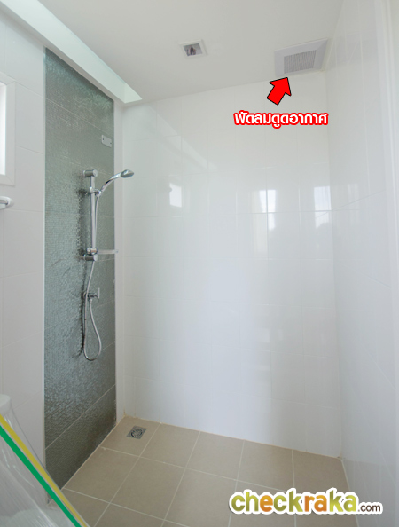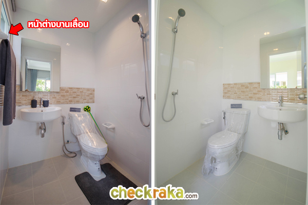 ด้านบนผนังยังมีหน้าต่างบานเลื่อนสำหรับเปิดระบายอากาศมาให้ 1 บาน เพราะห้องน้ำชั้นนี้ไม่มีพัดลมดูดอากาศมาให้