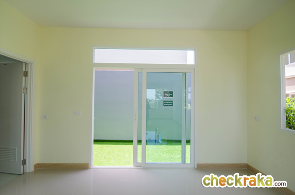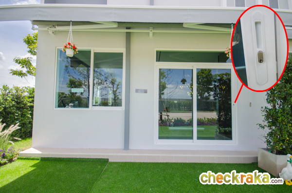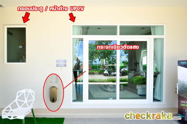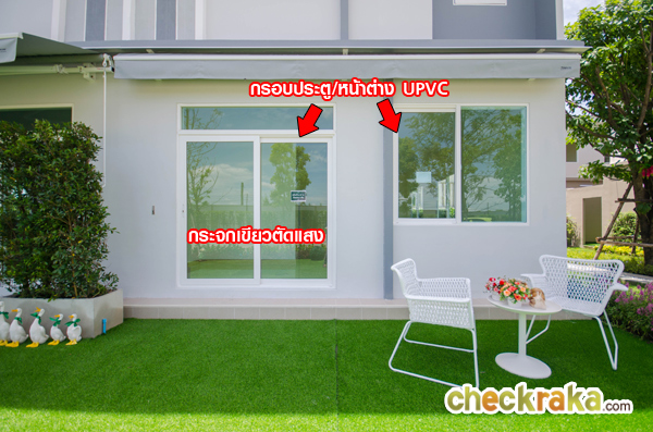 กรอบประตูและหน้าต่างเป็น UPVC สีขาว กระจกเขียวตัดแสงทั้งหลังช่วยกรองแสงไม่ให้ความร้อนเข้าไปสู่ตัวบ้าน