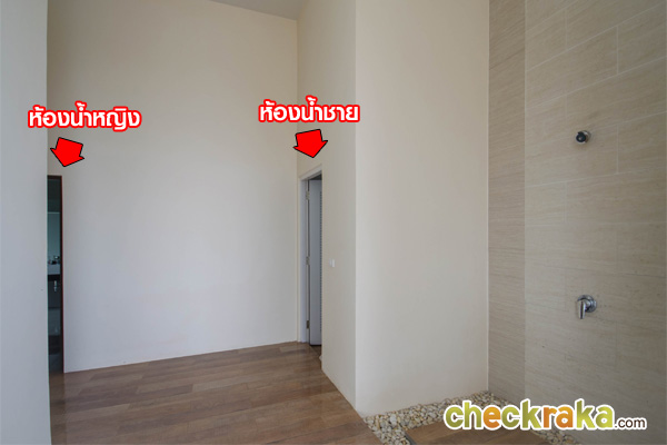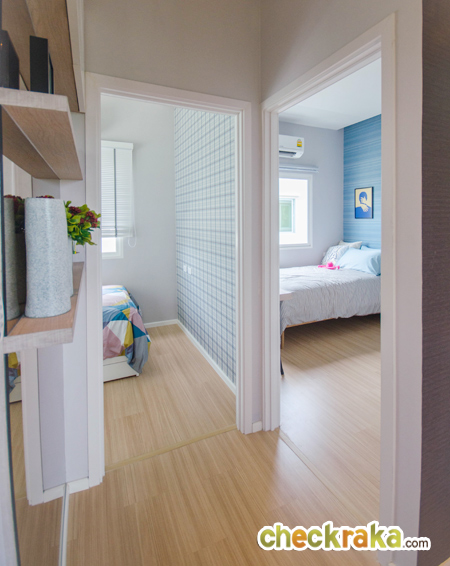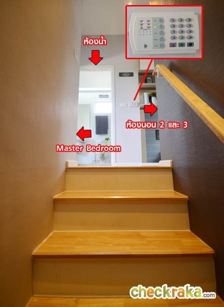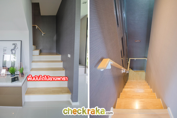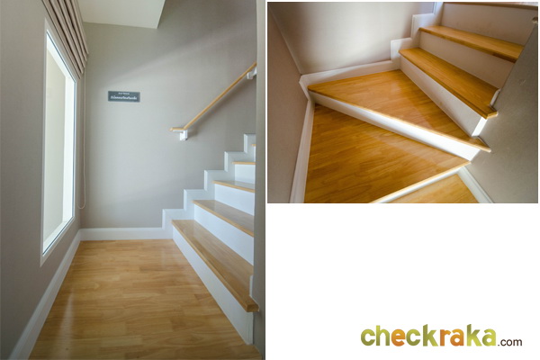 ขึ้นมาโถงด้านบน จะพบฟังก์ชั่น 3 ห้องนอน 1 ห้องน้ำ พื้นลามิเนตหนา 8 มม. มีความสูงจากพื้นถึงเพดาน 3 เมตร