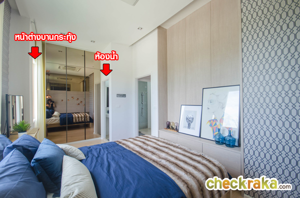 ห้อง Master Bedroom ห้องนี้จะวางตัวอยู่ฝั่งด้านหน้าบ้าน กินพื้นที่ตามความกว้างของบ้านเลยค่ะ ภายในห้องสามารถจัดวางตู้เสื้อผ้า เตียง โต๊ะเครื่องแป้ง และยังมีประตูทางเข้าห้องน้ำจากภายในห้องอีกด้วย