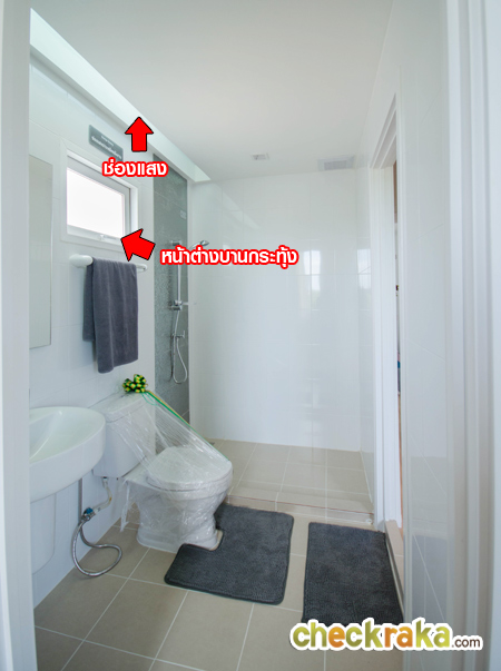 ห้องน้ำแบ่งส่วนแห้ง ส่วนเปียก กั้นด้วยธรณีสูง มีช่องแสงให้เหมือนทาวน์โฮมแบบที่แล้ว