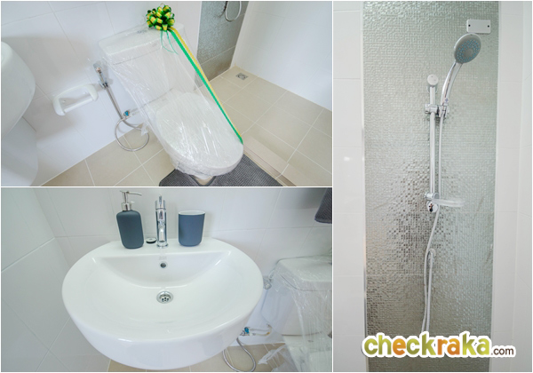 เจาะวัสดุภายในห้องน้ำ สุขภัณฑ์ภายในห้องน้ำเป็นของ American Standard ส่วนก็อกน้ำของ Sanwa
