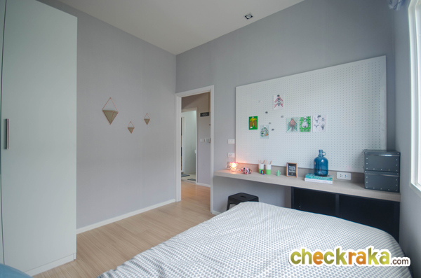 ยังมีพื้นที่ปลายเตียงเหลือพอให้ทำโต๊ะอ่านหนังสือ ผนังอีกฝั่งก็วางตู้เสื้อผ้าได้พอดี