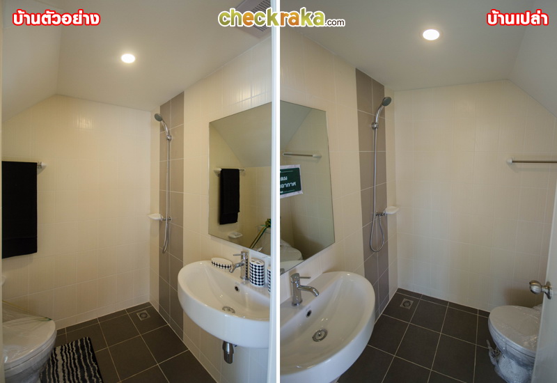 ห้องน้ำชั้นล่าง ทางโครงการมีโถสุขภัณฑ์ อ่างล้างหน้า และก๊อกน้ำมาให้ครบ และมีฝักบัวอาบน้ำมาให้ด้วย