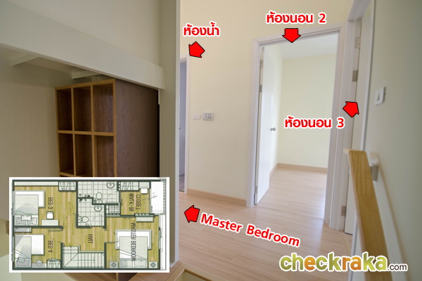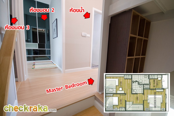 ชั้นบนประกอบไปด้วย 3 ห้องนอน กับ 2 ห้องน้ำ (1 ห้องน้ำในตัว)