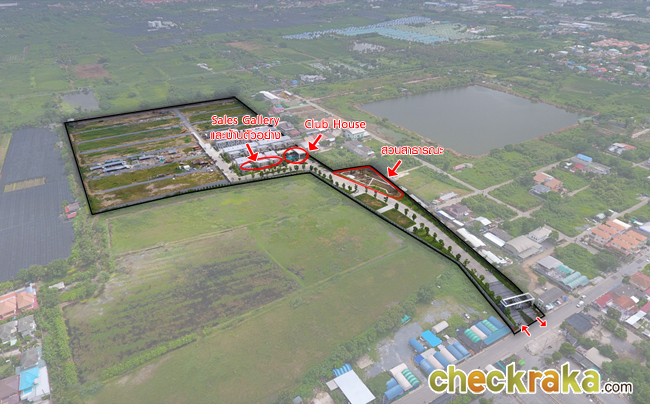 ขอบเขตโครงการ พื้นที่รอบๆ โครงการ ทางเข้า-ออก สวน คลับเฮ้าส์ และบ้านจากสถานที่จริง