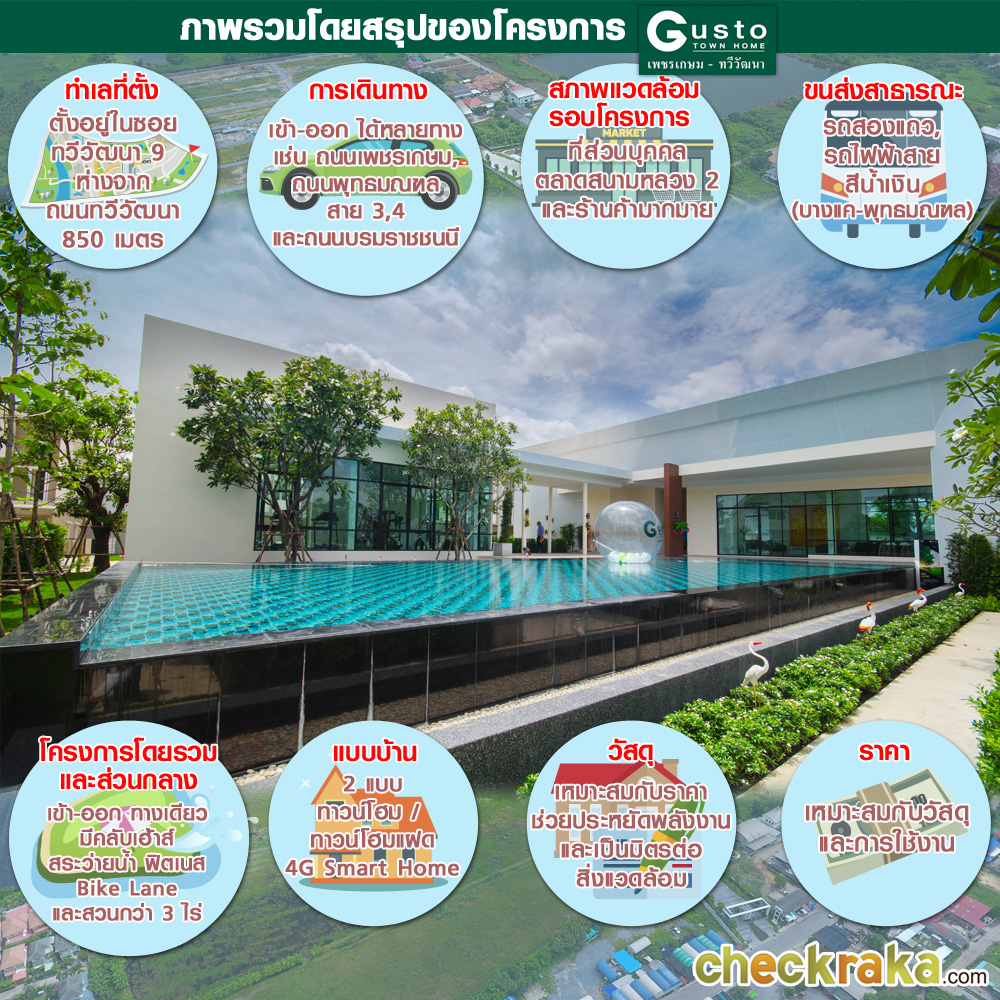 สำหรับวันนี้ CheckRaka.com ขอพาทุกท่าน ไปเยี่ยมชม และรีวิวทาวน์โฮมโครงการใหม่ในทำเลเพชรเกษม-ทวีวัฒนา ซึ่งเป็นหนึ่งในโครงการของกัสโต้ ที่ตั้งอยู่ในซอยทวีวัฒนา 9 โครงการที่ว่านี้คือ กัสโต้ ทาวน์โฮม เพชรเกษม - ทวีวัฒนา (Gusto Town Home Petkasem-Thaweewattana) ทาวน์โฮม และทาวน์โฮมแฝด 2 ชั้น หน้ากว้าง 5.7 เมตร กับบ้านรูปแบบใหม่ 4G Smart Home ที่ให้ความสำคัญในทุกๆ ด้านของการใช้ชีวิต พร้อมทั้งสิ่งอำนวยความสะดวก คลับเฮ้าส์ขนาดใหญ่ ที่มีทั้งสระว่ายน้ำ ฟิตเนส และสวนสีเขียวกว่า 3 ไร่ จะน่าสนใจแค่ไหน ตามมาชมรายละเอียดโครงการกันเลยค่ะ