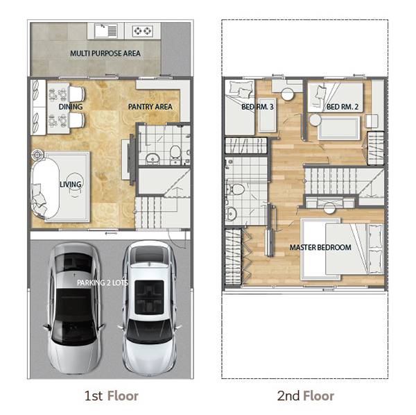 - แบบบ้าน RIVA - ทาวน์โฮม 2 ชั้น ขนาดที่ดินเริ่มต้น 17.88 ตร.ว. หน้ากว้างอาคาร 5.70 ม. พื้นที่ใช้สอยรวม 107 ตร.ม. 3 ห้องนอน 2 ห้องน้ำ 1 ห้องรับแขก 1 Pantry พร้อมพื้นที่ Multi Purpose Area และจำนวนที่จอดรถ 2 คัน
