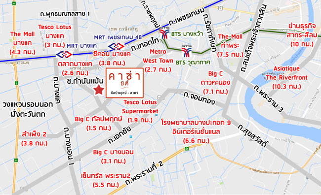 ภาพแผนที่โครงการแจกแจงให้เห็นระยะใกล้-ไกลของโครงการกับสถานที่ หรือ Landmark รอบๆ โครงการที่น่าสนใจตำแหน่ง GPS โดยประมาณของโครงการ = 13.699636, 100.433864