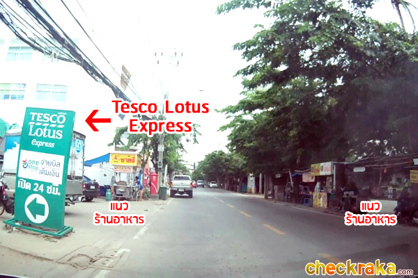 จากนั้นก็จะผ่าน Tesco Lotus Express ค่ะ แถวนี้ก็จะมีร้านอาหารริมทางตั้งอยู่หลายร้านเหมือนกัน