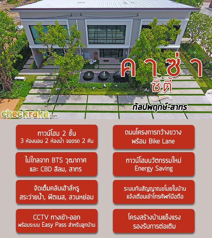 สวัสดีค่ะ วันนี้ Checkraka.com พาทุกท่านไปเยี่ยมชมทาวน์โฮมโครงการใหม่จาก Q House ที่ย่านกัลปพฤกษ์กันค่ะ โครงการ "คาซ่า ซิตี้ กัลปพฤกษ์-สาทร (Casa City Kanlapaphruek-Sathorn)" นั่นเอง ทาวน์โฮม 2 ชั้น 3 ห้องนอน 2 ห้องน้ำ ที่มาพร้อมนวัตกรรมการออกแบบใหม่เพื่อการอนุรักษ์พลังงาน เดินทางสะดวกเชื่อมเข้าสู่กลางเมืองย่าน CBD สีลมหรือสาทรได้สะดวก อีกทั้งยังไม่ไกลจากรถไฟฟ้า BTS สถานีบางหว้าและสถานีวุฒากาศ ไปดูรายละเอียดภายในโครงการกันดีกว่าค่ะ ว่ามีสิ่งน่าสนใจอะไรบ้าง