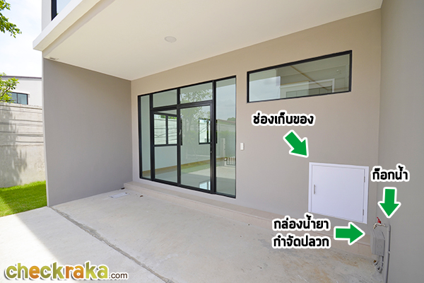 หน้าบ้านมีช่องเก็บของ, ก๊อกน้ำ และกล่องน้ำยากำจัดปลวก