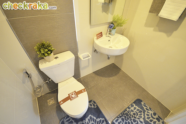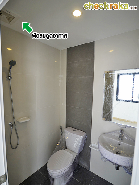 ห้องน้ำด้านล่างขนาดกะทัดรัด มีพัดลมดูดอากาศและสุขภัณฑ์ American Standard