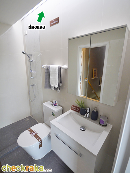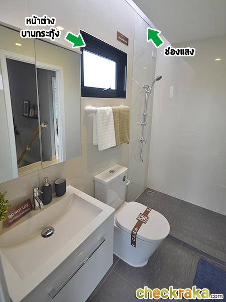 ห้องน้ำมีช่องแสงด้านบน และหน้าต่างบานกระทุ้งเพื่อระบายอากาศ สุขภัณฑ์จาก American Standard