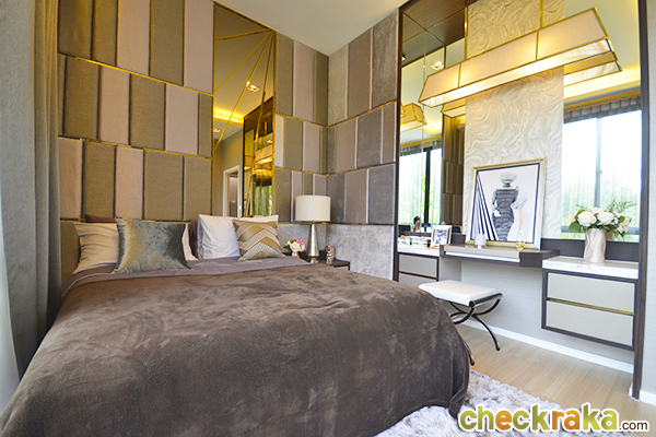 แต่ก็มีพื้นที่ปลายเตียงยาวไปถึงหน้าห้องน้ำเหลือเยอะ สำหรับวางตู้เสื้อผ้าหรือวางโซฟาเล็กๆ ได้