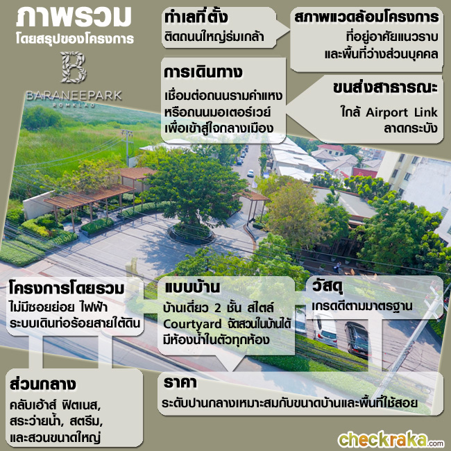 วันนี้ CheckRaKa.com ขอพาทุกท่านไปเยี่ยมชมบ้านเดี่ยวสไตล์ Courtyard หลังใหญ่ ของ บริษัท มานะ พัฒนาการ จำกัด ตัวโครงการตั้งอยู่ติดถนนร่มเกล้า ซึ่งเป็นถนนเชื่อมต่อไปได้หลายเส้นทาง โครงการที่ว่านี้ คือ "บารานี พาร์ค ร่มเกล้า (Baranee Park Romklao)" กับบ้านสไตล์ Courtyard ที่มีจุดเด่นตรงที่แบบบ้านหลังใหญ่ ให้คุณได้ใกล้ชิดธรรมชาติได้ส่วนตัวมากขึ้นด้วยการยกสวนมาไว้ในบ้าน ตลอดจนบรรยากาศภายในโครงการที่มีทั้งคลับเฮ้าส์ ห้อง Fitness สระว่ายน้ำ ห้องสตีม และสวนส่วนกลางขนาดใหญ่สำหรับการพักผ่อน แค่เกริ่นนำก็น่าสนใจแบบนี้ ลองไปชมรายละเอียดโครงการกันเลยค่ะ