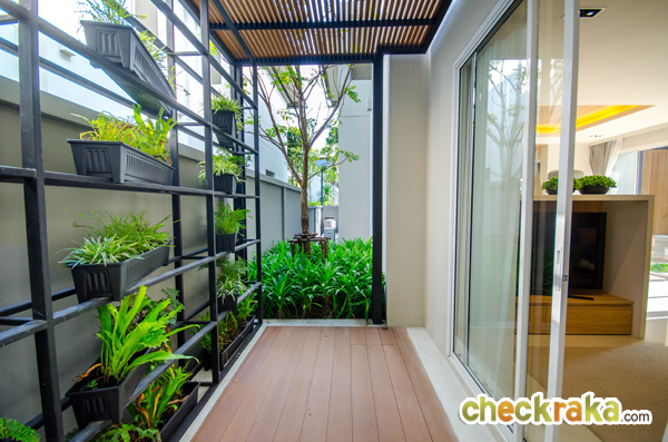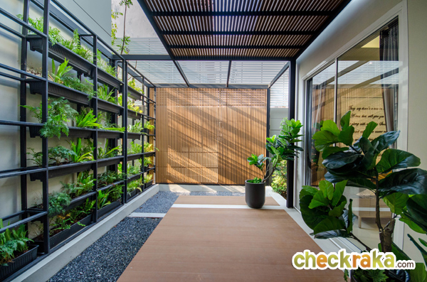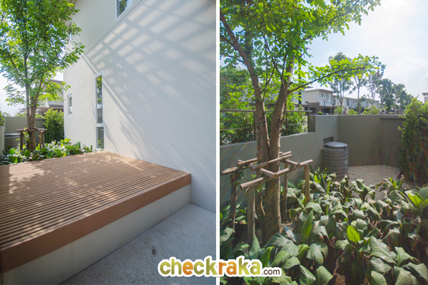 ด้านข้างบ้านอีกฝั่งตกแต่งให้เป็นชั้นวางปลูกต้นไม้ เพื่อความสบายตา