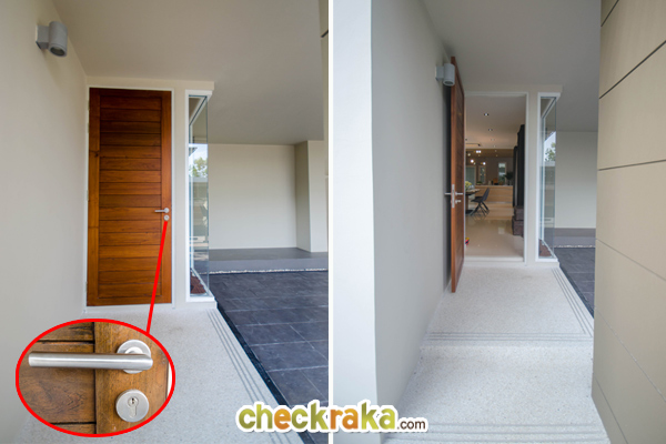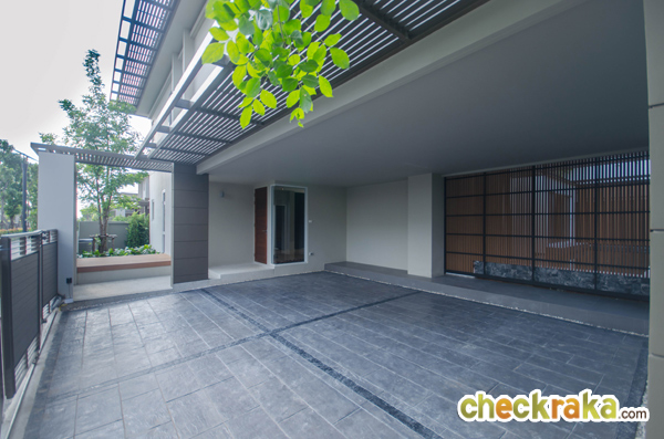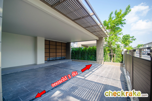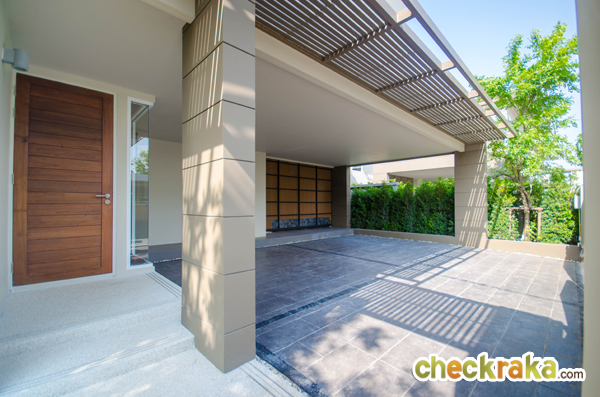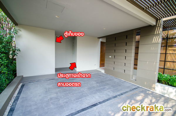 ลานจอดรถจอดได้ 2 คัน มองตรงไปจะเห็นประตูบานเลื่อน สามารถเดินเข้าบ้านจากตรงนี้ได้