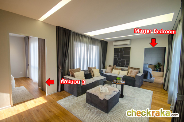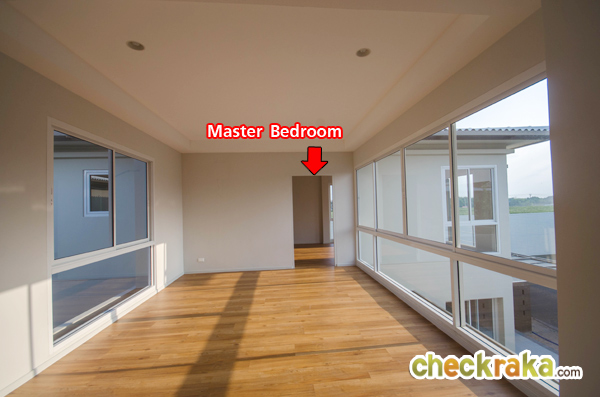 Master Bedroom ห้องที่มีขนาดใหญ่สุดของบ้าน ฝั่งขวามือคือประตูบานเลื่อนที่เปิดออกไประเบียงส่วนตัว