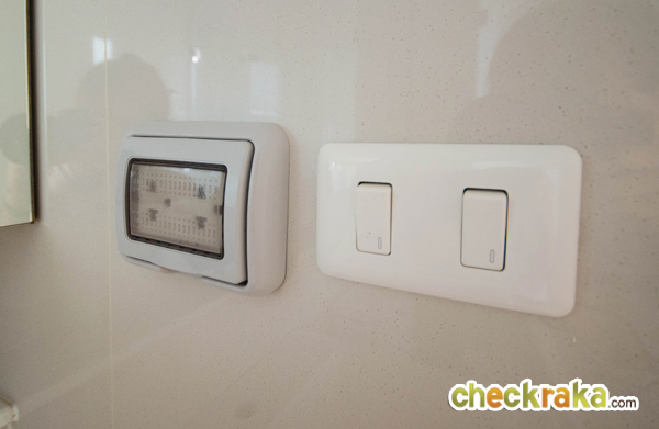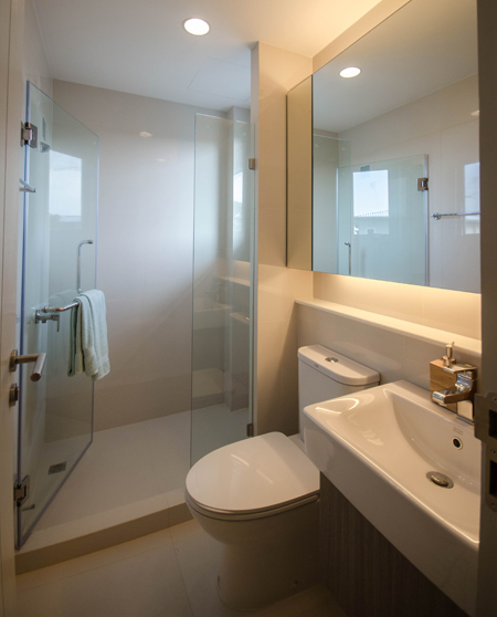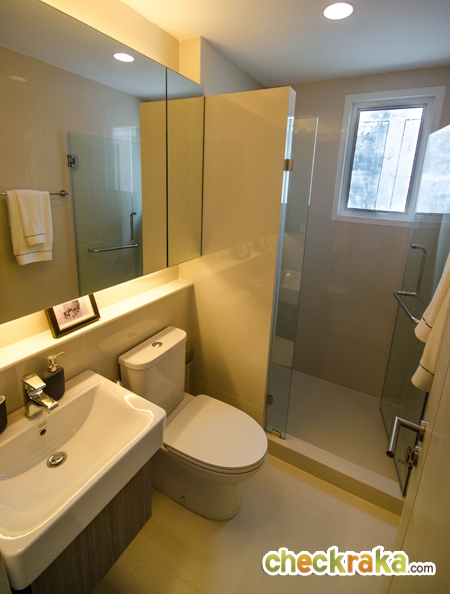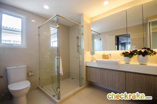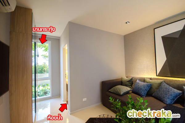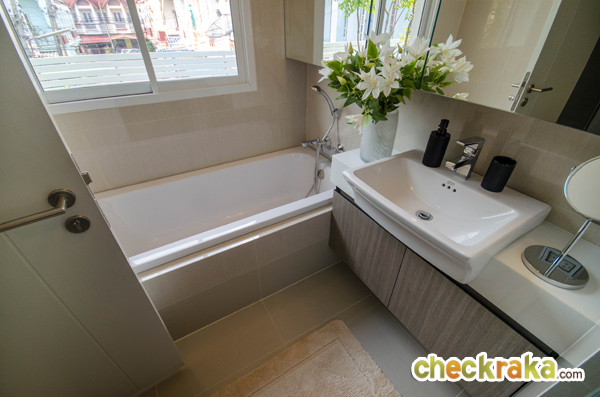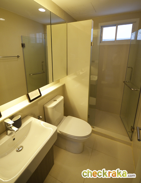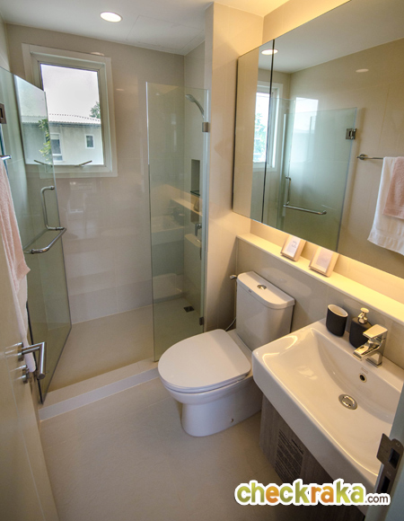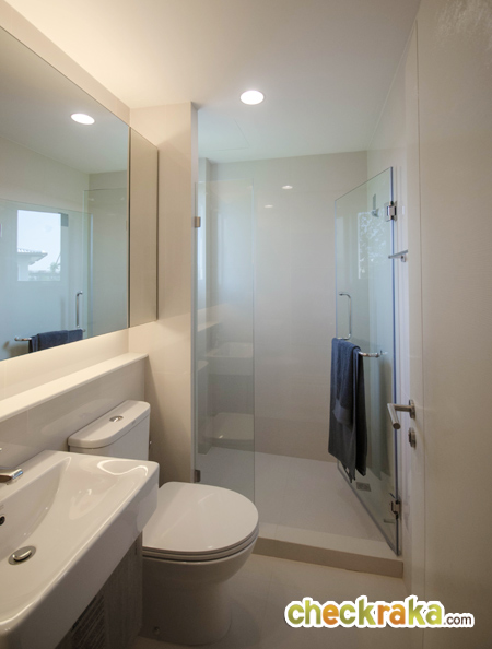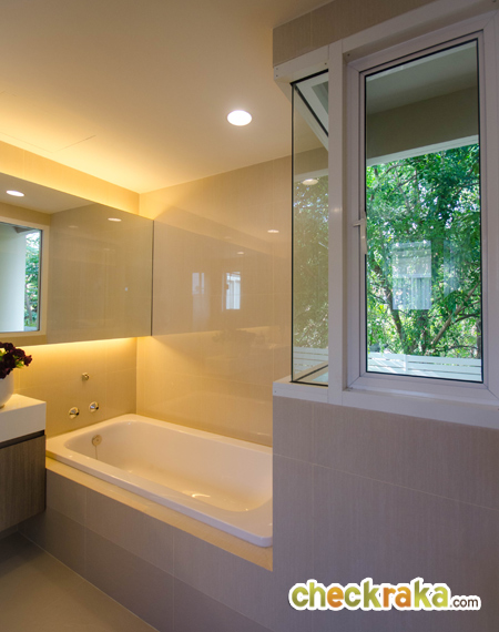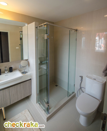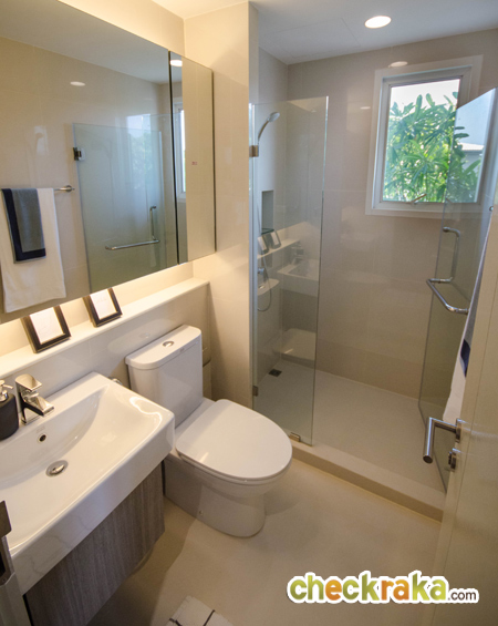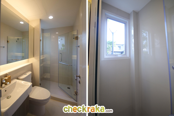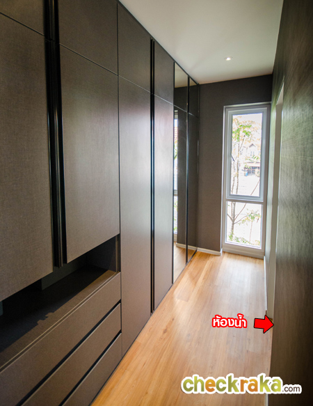 หน้าทางเข้าห้องน้ำมีพื้นที่สำหรับวางตู้เสื้อผ้า และมีหน้าต่างบานกระทุ้งพร้อมกระจกบาน Fix