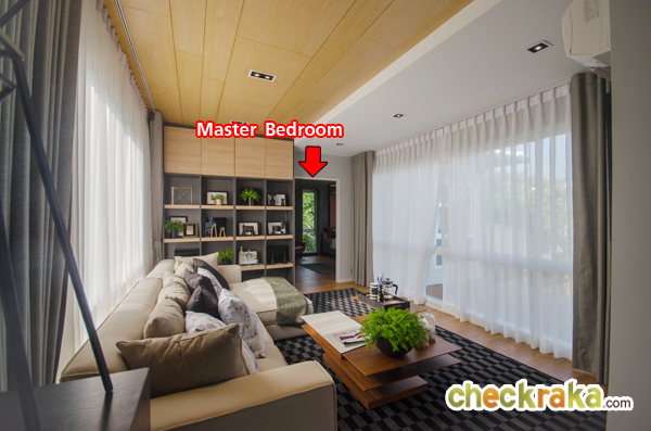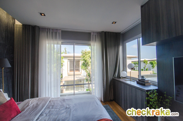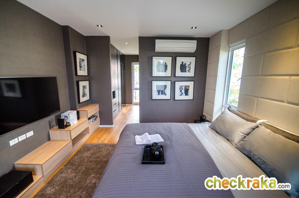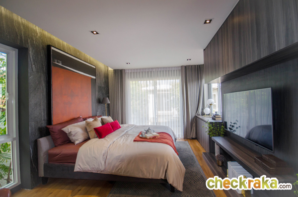 Master Bedroom เป็นห้องที่มีขนาดใหญ่สุดของบ้าน เปิดประตูบานเลื่อนออกไปเป็นระเบียงส่วนตัว