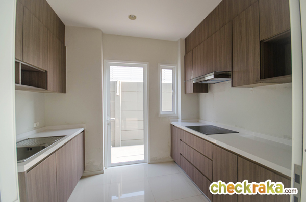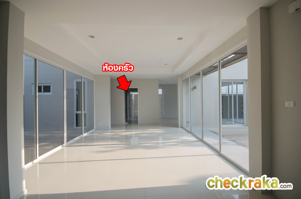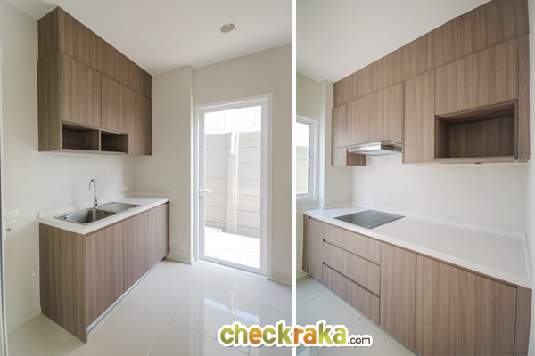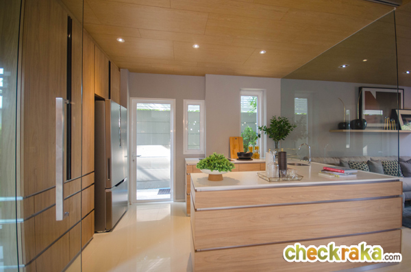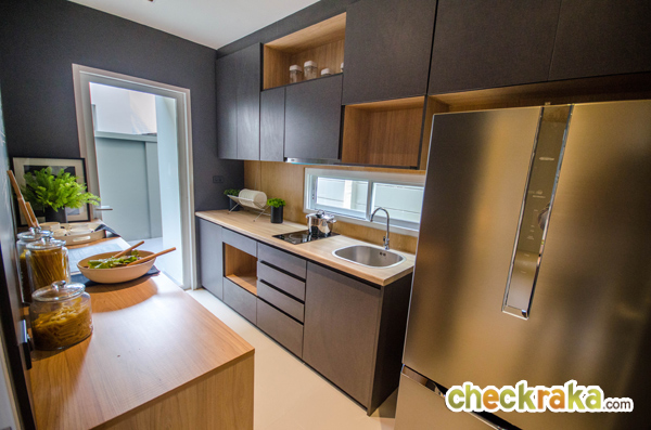 ห้องครัววางตัวอยู่ด้านหน้าบ้าน สำหรับบ้านเปล่ามาตรฐานจะติดตั้งชุดครัวและเครื่องดูดควันมาให้ด้วยนะคะ