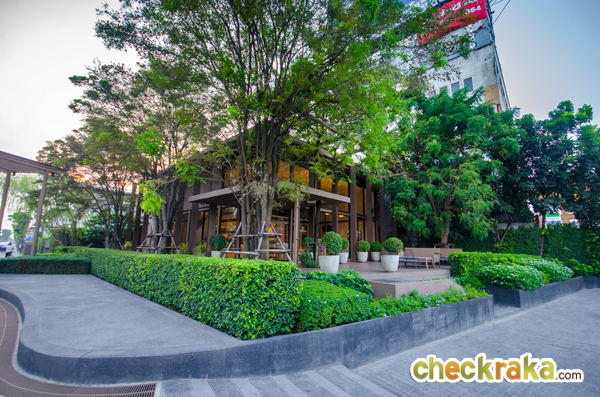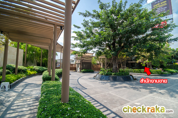 ด้านหน้าโครงการติดถนนร่มเกล้า ป้ายชื่อโครงการตรงทางเข้า-ออกมีขนาดใหญ่ ด้านหน้าจัดสวนหย่อม
