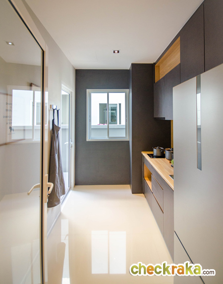 ส่วนฝั่งนี้ที่เป็นผนังทึบจัดวางตู้เย็นและ Pantry เตรียมอาหาร