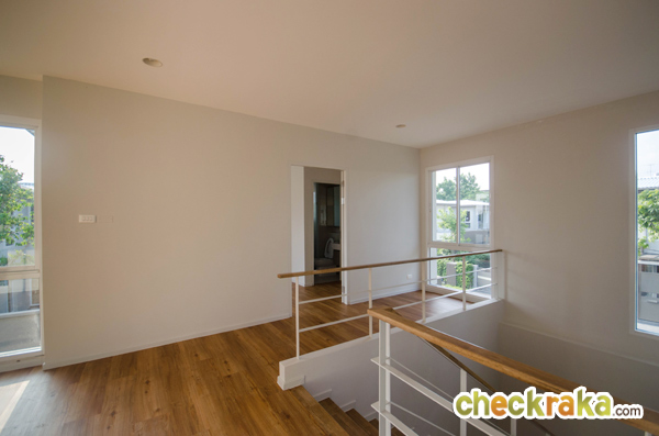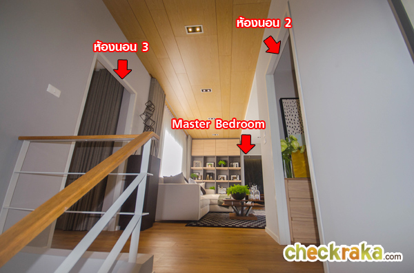 ขึ้นมาที่ชั้นบน ห้องนอน 2 และ 3 อยู่ข้างบันไดแบบนี้เลยค่ะ แต่บ้านตัวอย่างหลังนี้ ได้ต่อเติมผนังห้องนอน 2