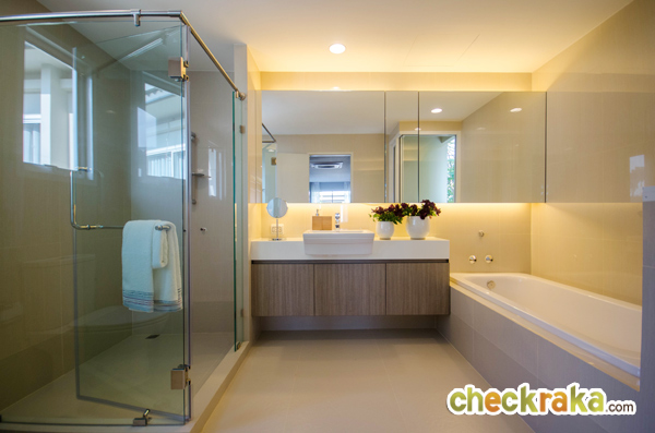 อีกฝั่งเป็นที่อาบน้ำกั้นด้วยกระจกนิรภัย ก่อธรณีขึ้นแยกส่วนเปียก/แห้ง ข้างกันคือโถสุขภัณฑ์