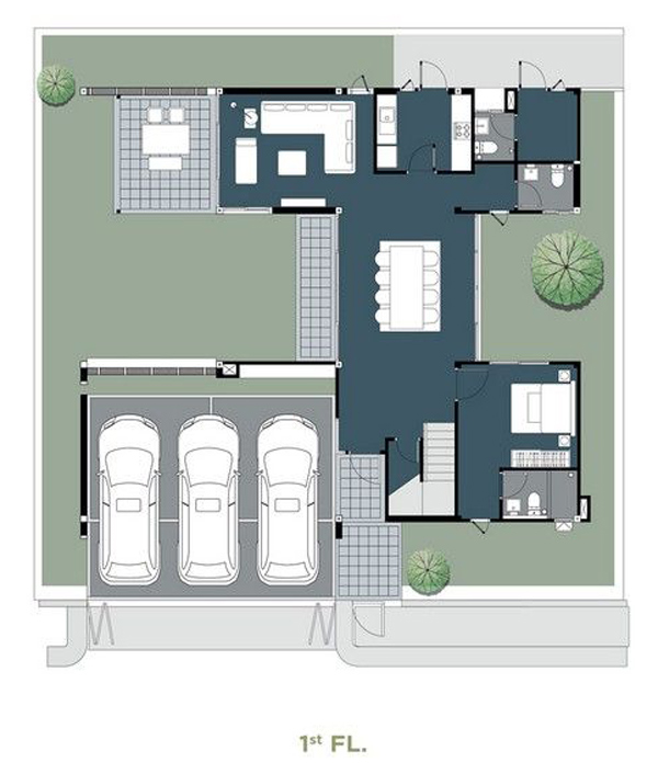 สามารถกั้นส่วนนี้เป็นห้องนอนชั้นล่างสำหรับแขก หรือผู้สูงอายุก็ได้ เพราะชั้นล่างมีห้องน้ำที่มีส่วนอาบน้ำ