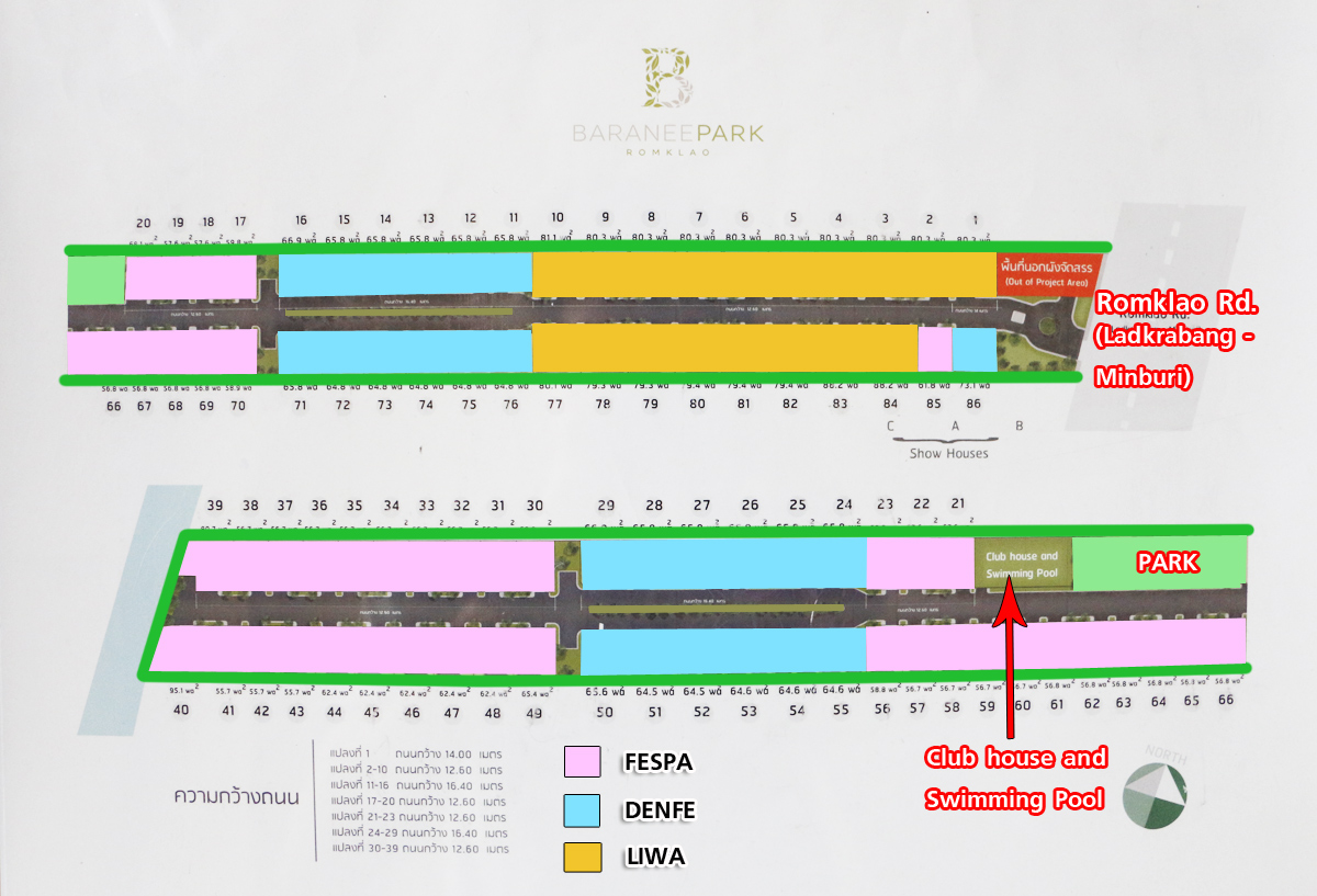 - เฟส 3 ช่วงแปลงที่ 17-23 ถนนกว้าง 12.60 เมตร (ที่ตั้งคลับเฮ้าส์และสวนสาธารณะ)