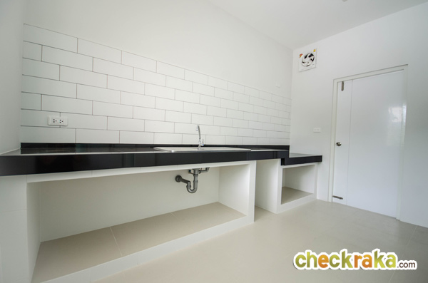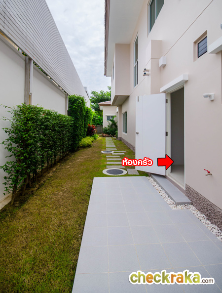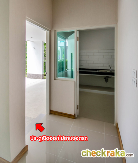 ติดกับห้องน้ำคือ ครัว ติดกับประตูครัวเป็นประตูที่สามารถเปิดออกไปลานจอดรถได้
