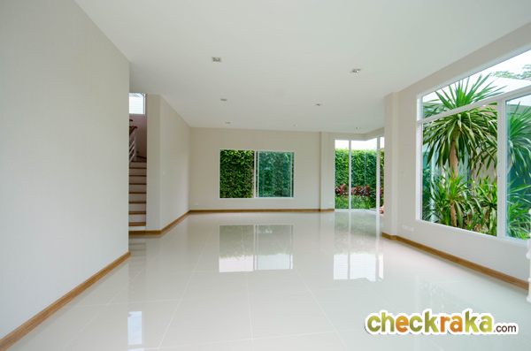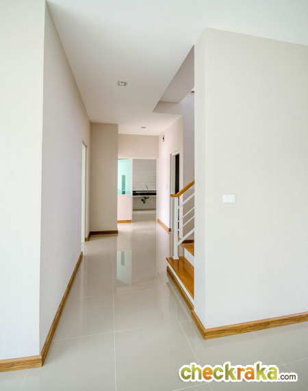 เปิดเข้ามาในตัวบ้านเป็นโถงกว้าง พื้นชั้นล่างปูด้วยแกรนิตโต้ 60 x 60 ซม. ชั้นล่างมีความสูงประมาณ 2.7 เมตร