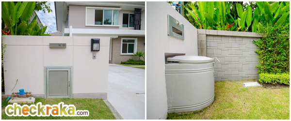 ตรงกำแพงหน้าบ้านมีถังขยะแบบฝังกำแพงมาให้เปิดทิ้งจากข้างในบ้านได้เลย ทางโครงการจะลงต้นไม้ใหญ่ให้ทุกหลัง