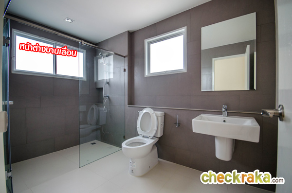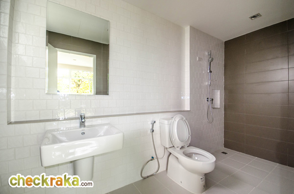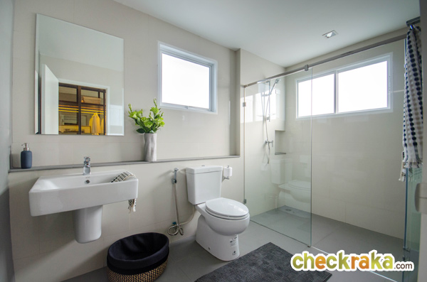 ตรงข้ามห้องนอนชั้นล่าง คือ ห้องน้ำ มีฟังก์ชันให้ครบ สุขภัณฑ์ทั้งหมดเป็นของ American Standard