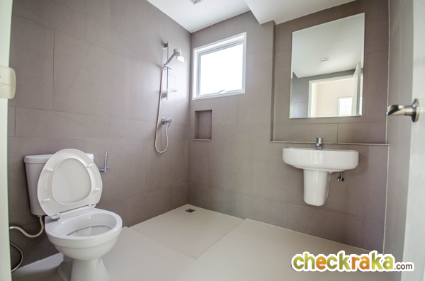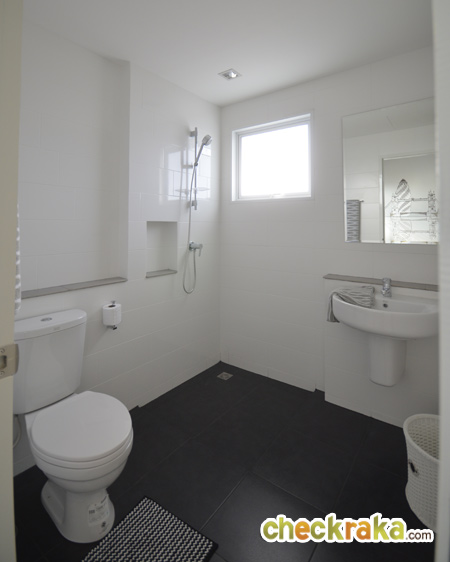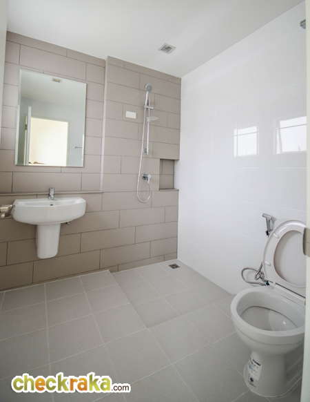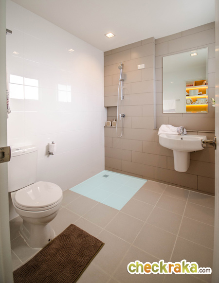 ห้องน้ำภายในห้องนี้ให้สุขภัณฑ์เหมือนห้องน้ำชั้นล่าง พื้นที่สีฟ้าที่เห็นในรูป คือพื้นลดระดับสำหรับพื้นที่เปียก