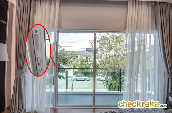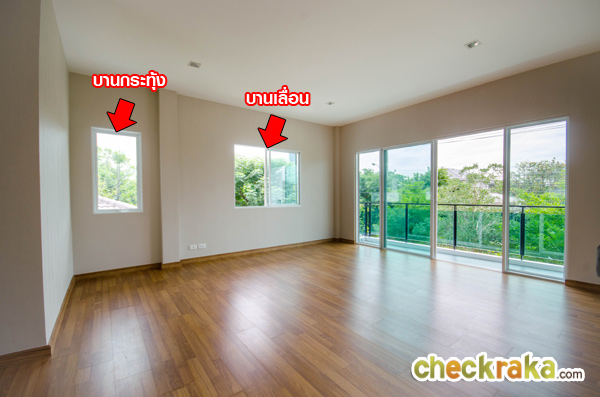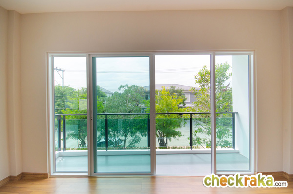 ประตูบานเลื่อน เปิดออกไปชมวิวที่ระเบียงได้ มีหน้าต่างบานเลื่อน 1 บาน บานกระทุ้ง 1 บาน